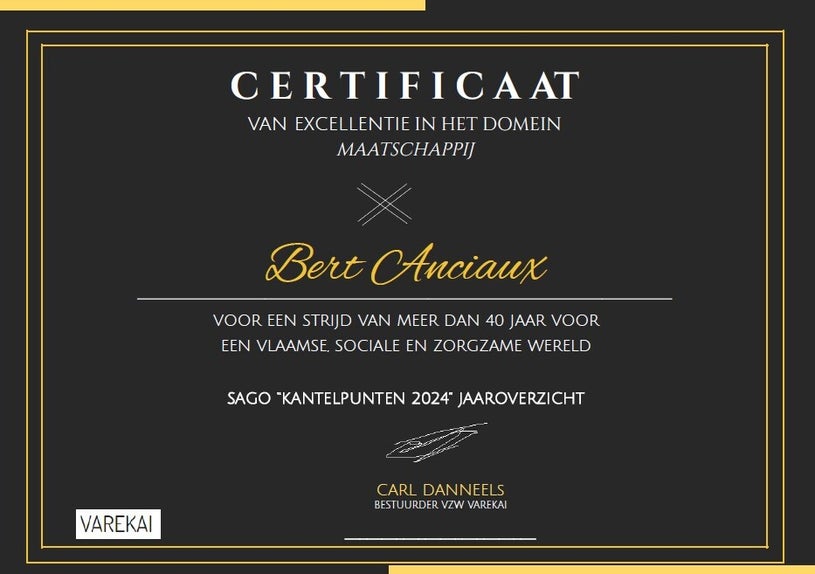 Bert nam na meer dan 40 jaar afscheid van de politiek met een speech in de Senaat, waarin hij aandacht vroeg voor de ernstige problematiek van kindermisbruik. Voor zijn blijvende maatschappelijke betrokkenheid ontvangt hij het Certificaat voor Uitmuntendheid in het Domein Maatschappij.