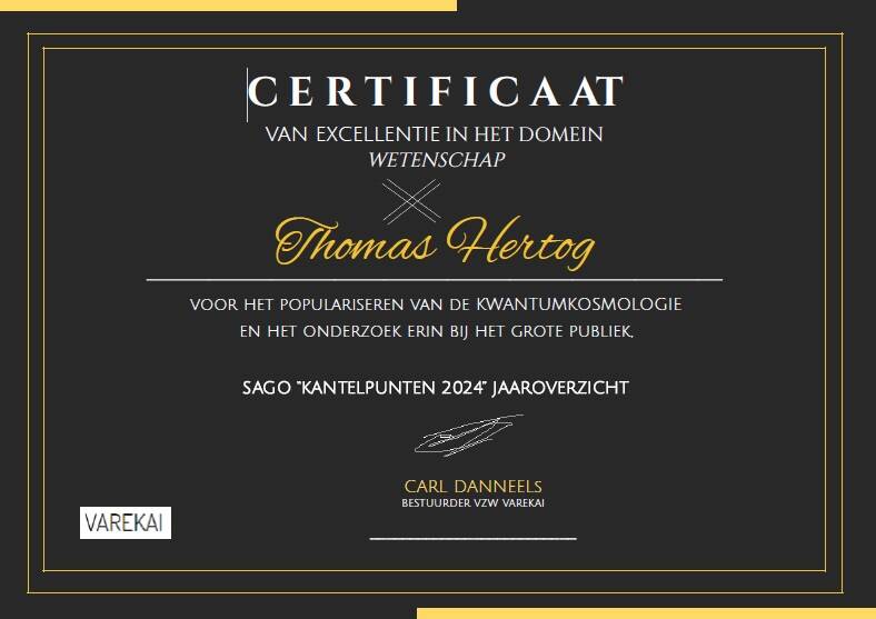 Thomas Hertog ontvangt het Certificaat voor Uitmuntendheid in Wetenschap voor zijn baanbrekende visie op de oorsprong van het heelal. In zijn boek The Origin of Time stelt hij dat de fysische wetten zelf geëvolueerd kunnen zijn in de beginfase van het universum, een theorie die afwijkt van de gangbare kosmologische modellen.